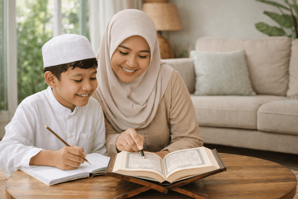 Ibu berhijab mengajar anak secara privat 1 on 1 membaca Al-Qur’an di ruang tamu rumah yang nyaman.